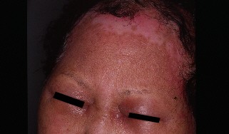毛染めのカブレ(眼瞼が開かないくらい腫れている) パッチテスト(この方は手術用の手袋でした)